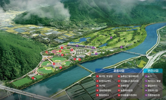 시가 휴양단지 내 조성 중인 공공사업은 농촌체험(농촌테마공원)·6차 산업(농축임산물종합판매타운)·휴양(국제웰니스토리타운, 반려동물지원센터)·스포츠(스포츠파크)·생태관광(영남알프스 생태관광센터, 고산습지센터) 등의 테마로 구성된 전국 최초의 복합테마단지다. 7개 공공사업은 모두 국비지원 사업과 공모사업을 통해 유치한 사업으로 관광단지 개발의 우수사례로 평가된다.