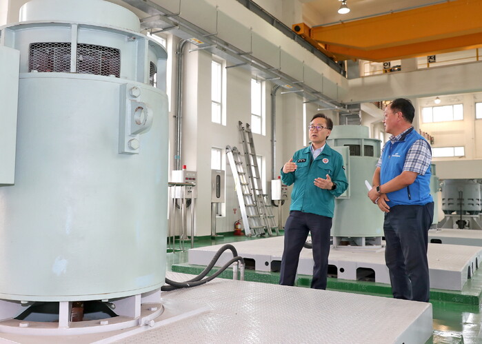 | ▲ 유성훈 구청장(왼쪽)이 시흥빗물펌프장에서 빗물펌프를 점검하고 있다. (사진=금천구청 제공) |