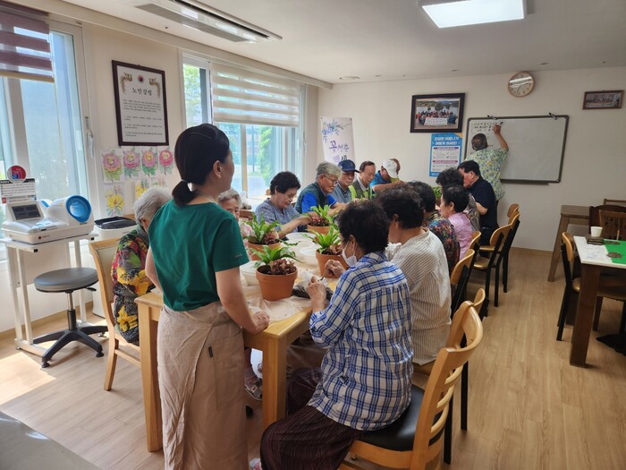 경기 오산시보건소 건강생활지원센터는 최근 3주에 걸쳐 ‘백세만세 건강놀이학교’를 지곶동에 위치한 이편한세상 아파트 경로당에서 진행했다. 사진은 최근 스트레스 관리 및 심신 안정 도모를 위한 원예수업을 진행하고 있는 모습. (사진=오산시청 제공)