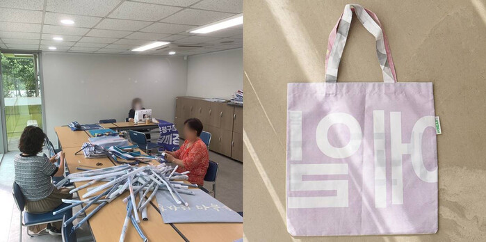 | ▲ 자원봉사센터의 폐현수막 만드는 모습과 완성된 에코백 모습. (사진=은평구청 제공) |