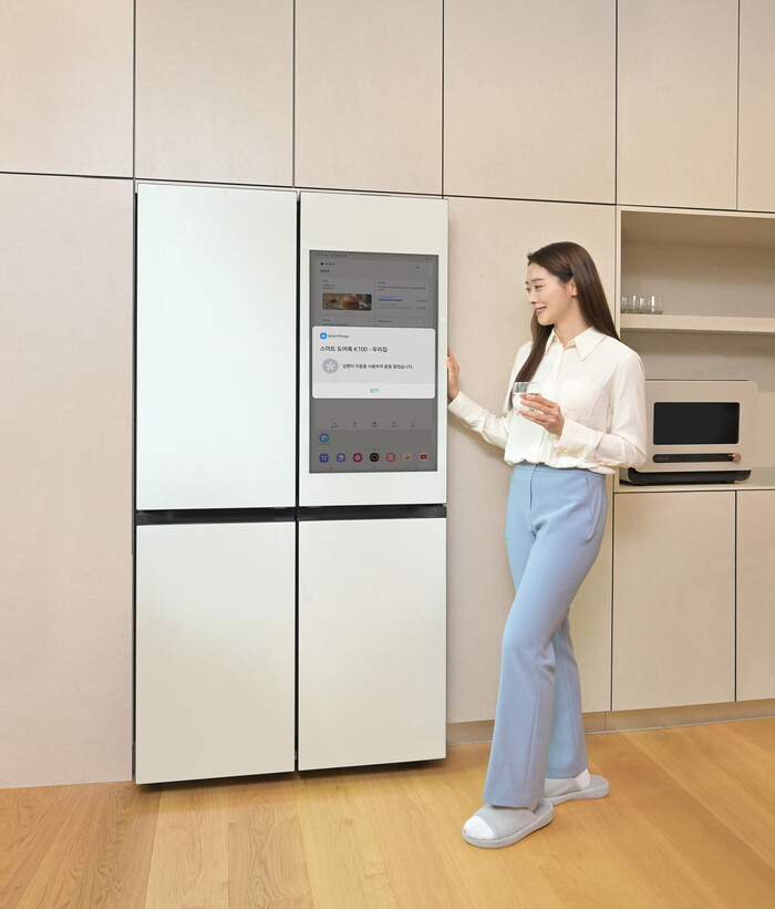 | ▲ 삼성전자 모델이 비스포크 AI 패밀리허브 스크린으로 아카라 스마트 도어록과 연동된 스마트싱스 앱을 사용하고 있다.(사진=삼성전자 제공) |