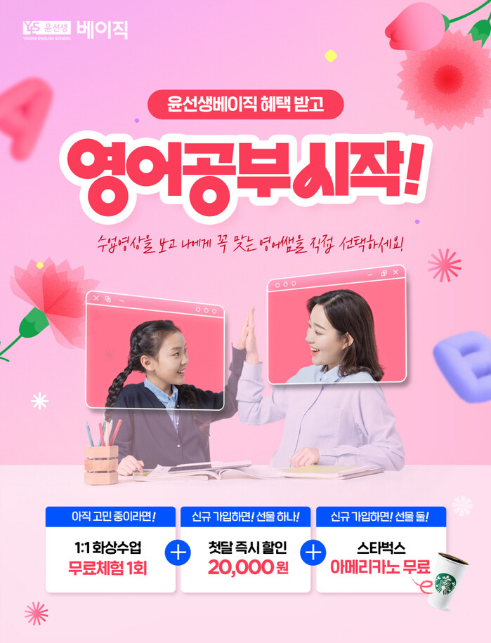 윤선생베이직은 체험 수업을 마친 후 오는 30일까지 가입한 신규 회원에게 첫 달 영어 학습비 2만원 할인 혜택과 함께 스타벅스 아메리카노 기프티콘을 증정한다.