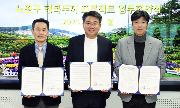서울 노원구가 지난 10일 행복나래(주)와 행복도시락과 함께 급식 사각지대에 있는 결식 우려 아동들에게 안정적인 식사를 제공하기 위해 ‘노원구 행복두끼 프로젝트’ 업무 협약을 체결했다. 사진은 오승록 구청장(가운데)이 관계자들과 기념 촬영을 하는 모습. (사진=노원구청 제공)