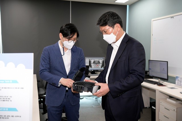 [광주=정찬남 기자] 조인철 광주광역시 문화경제부시장(우측)이 16일 오후 메타버스 기반기술 구축 현장인 한국전자기술연구원을 방문해 시설을 점검하고 있다. /광주광역시 제공