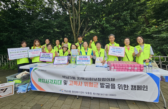[인천=문찬식 기자] 인천 서구 석남3동 행정복지센터(동장 강성재)는 지역사회보장협의체(공동위원장 김종권)가 지난 15일 생계 곤란 및 가족·사회적 관계 고립으로 어려움을 겪고 있는 위기가구를 발굴하기 위해 『복지사각지대 및 고독사 위험군 발굴 캠페인』을 실시했다고 밝혔다.