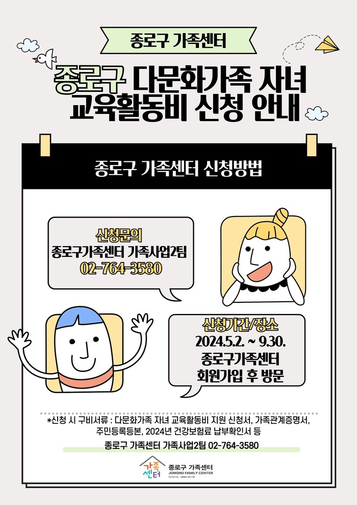 [시민일보 = 이대우 기자] 서울 종로구(구청장 정문헌)가 9월 30일까지 다문화가족 초중고 자녀 교육활동비 신청을 접수한다.