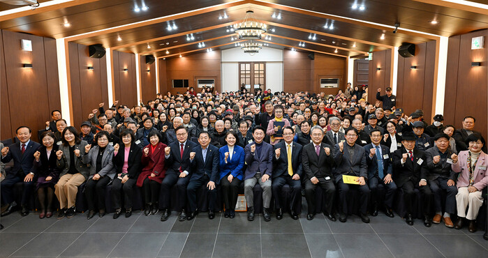 (사)대한노인회 의정부시지회가 최근 의정부농협 3층에서 김동근 경기 의정부시장을 비롯해 이사회 임원, 지역내 경로당 회장 및 사무장 등 260여명이 참석한 가운데 ‘2025년 정기총회 및 상반기 지도자 교육’을 실시했다. 사진은 김 시장이 참석자들과 함께 기념 촬영을 하는 모습. (사진=의정부시청 제공)