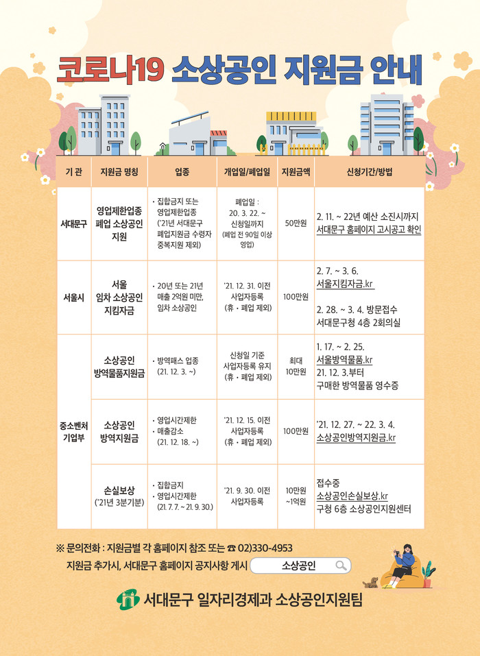신청 기간은 지난 11일부터 예산 소진 시까지며, 대상은 2020년 3월22일부터 신청 당일까지 서대문세무서에 폐업 신고한 집합금지, 영업제한 업종 소상공인이다.