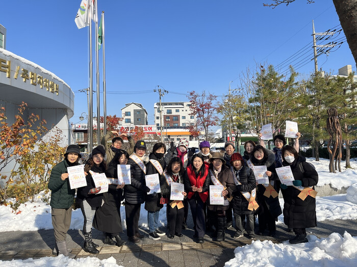 경기 오산시 중앙동이 최근 오색시장 일대에서 명예사회복지공무원인 중앙동 통장과 함께 복지사각지대 발굴을 위한 캠페인 '해뜰두드림'을 실시했다. 해당 캠페인은 명예사회복지공무원과 함께 취약지역 등을 다니며 위기가구 제보 안내, 복지서비스 연계 등을 지원한다. 사진은 캠페인 관계자들이 기념 촬영하는 모습. (사진=오산시청 제공)