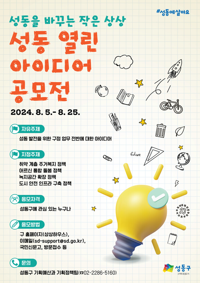 [시민일보 = 이대우 기자] 서울 성동구(구청장 정원오)는 오는 25일까지 ‘성동 열린 아이디어 공모전’을 개최한다.