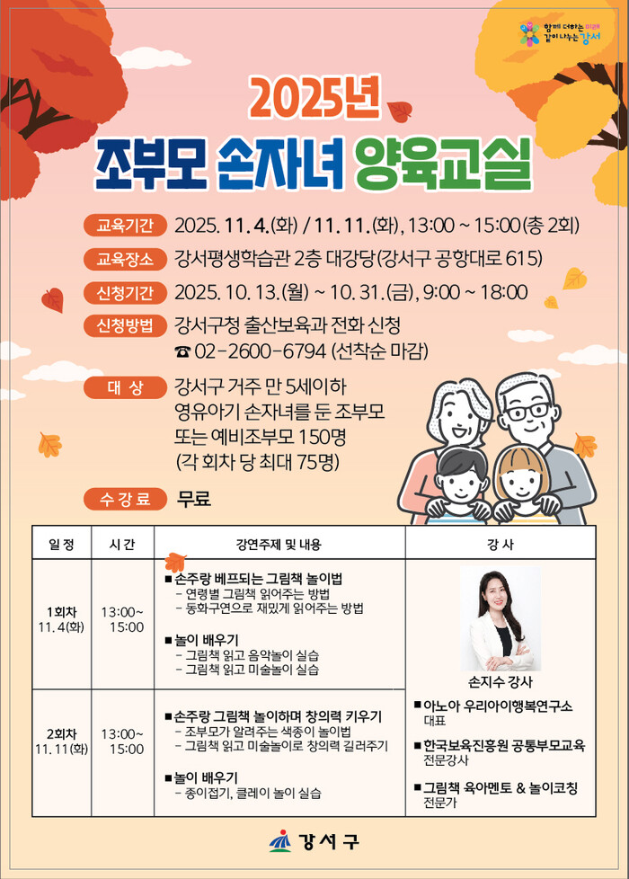 신청 대상은 강서구에 거주하는 만 5세 이하의 손자녀를 둔, 조부모나 예비 조부모다.