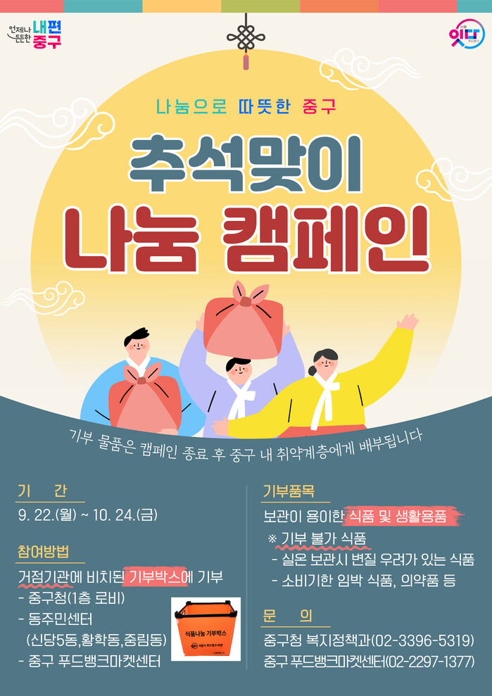 [시민일보 = 여영준 기자] 서울 중구가 다가오는 추석 명절을 앞두고 어려운 이웃을 돕기 위해 '2025 추석맞이 나눔 캠페인'을 진행한다.