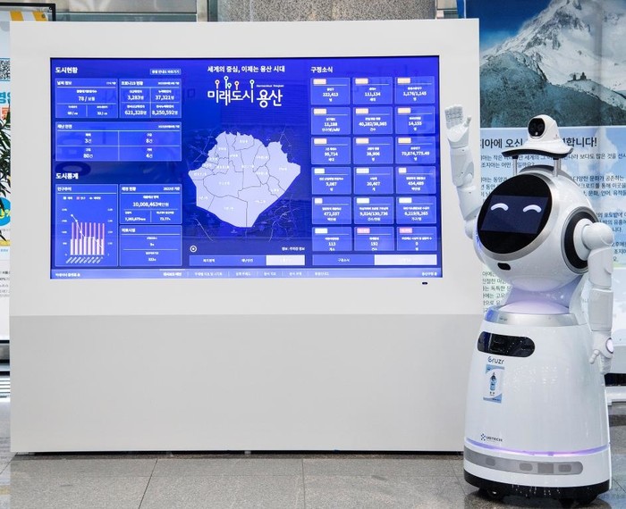 | ▲ 지난 18일 '용봇'이 용산구종합행정타운 로비에 설치된 빅데이터 플랫폼 스크린 앞에서 활짝 웃고 있다. (사진제공=용산구청) |