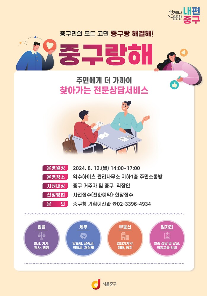 [시민일보 = 여영준 기자] 서울 중구가 8월 찾아가는 전문 상담 서비스 ‘중구랑해’ 운영을 앞두고 지난 29일부터 오는 9일까지 사전접수를 받고 있다.