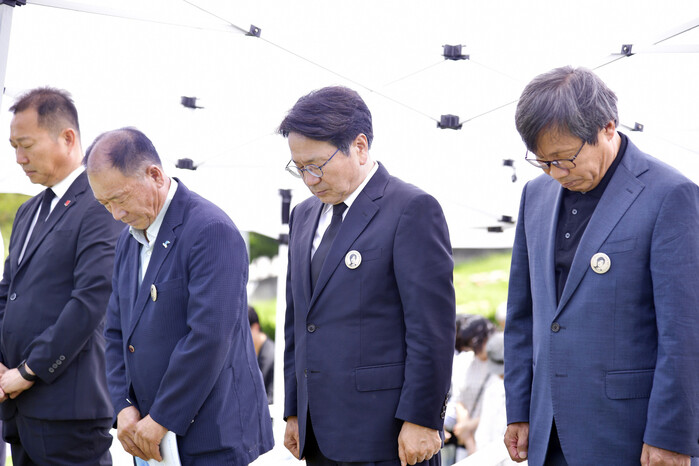 [광주=정찬남 기자] 강기정 광주광역시장이 5일 오후 북구 망월동 민족민주열사묘역에서 진행된 '36주기 이한열 추모식'에 참석해 묵념을 하고 있다./광주광역시 제공