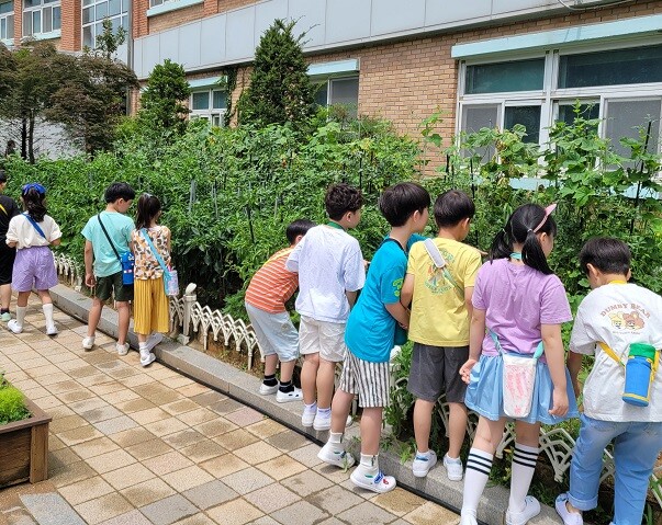 서울 금천구는 지역내 초등학교 5학년 학생들을 대상으로 ‘우리 학교 텃밭 가꾸기‘ 교육을 진행하고 있다. 사진은 학생들이 최근 우리 학교 텃밭 가꾸기 교육에 참여하고 있는 모습. (사진=금천구청 제공)