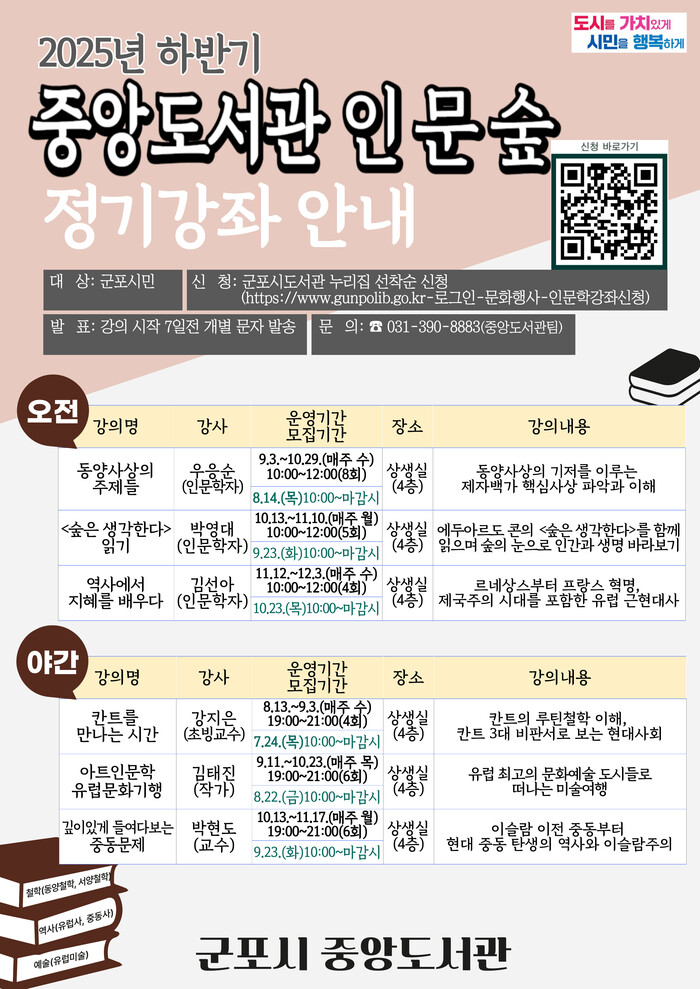 [군포=송윤근 기자] 경기 군포시 중앙도서관은 시민들의 인문학적 소양을 함양하고자 2025년 하반기 인문학 프로그램인 ‘중앙도서관 인문숲’ 강좌를 운영한다.