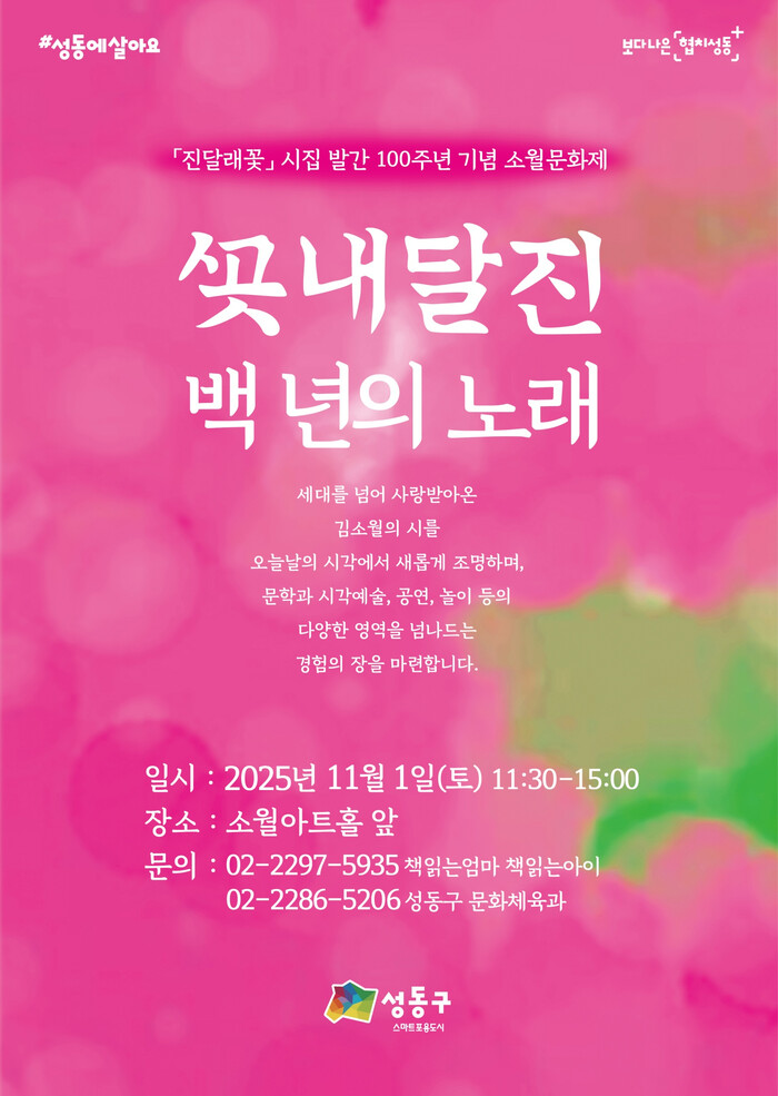[시민일보 = 박소진 기자] 서울 성동구(구청장 정원오)는 김소월 시집 ‘진달래꽃’ 출간 100주년을 기념해 오는 11월1일 ‘진달래꽃, 백년의 노래’를 주제로 ‘2025 소월문화제’를 개최한다고 밝혔다.