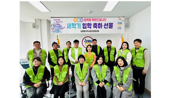 경기 광주시 능평동 지역사회보장협의체는 12일 2025년 입학을 맞이한 취약계층 초·중·고 입학생에게 ‘새 학기 입학 축하 선물’을 전달했다. 사진은 전달식에서 관계자들이 기념촬영을 하는 모습. (사진=광주시청 제공)