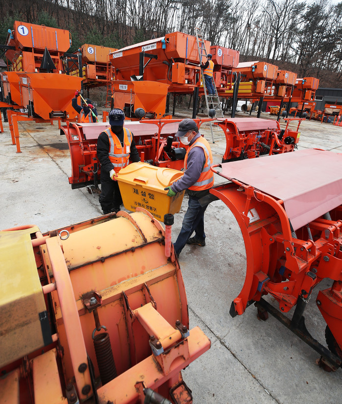 9일 오전 경기 수원시 영통구청 제설전진기지에서 관계자들이 살포기 등 제설 장비를 점검하고 있다. 수원시는 대설ㆍ한파 등 겨울철 자연 재난으로부터 시민들을 보호하기 위해 제설전진기지, 상습결빙구간 등에 대한 안전 점검을 진행한다.