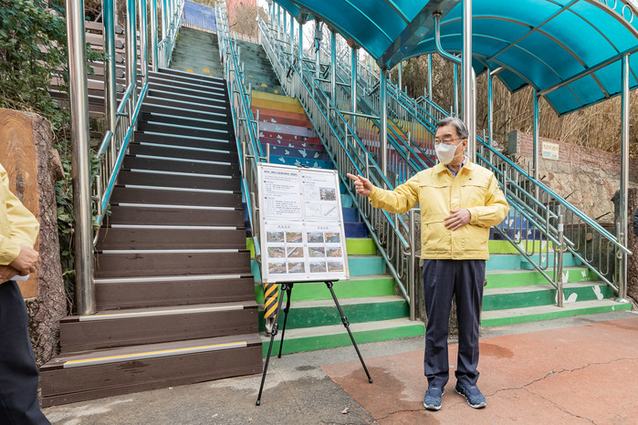 김선갑 서울 광진구청장은 9일 가파른 경사의 계단으로 돼 있어 안전사고 발생 우려가 높은 용곡초·중학교 통학로 진입계단 개선현황을 확인하기 위해 현장점검에 나섰다. 사진은 이날 김 구청장(오른쪽)이 추가 설치된 계단을 점검하고 주민들에게 현황 설명을 하고 있는 모습. (사진제공=광진구청)