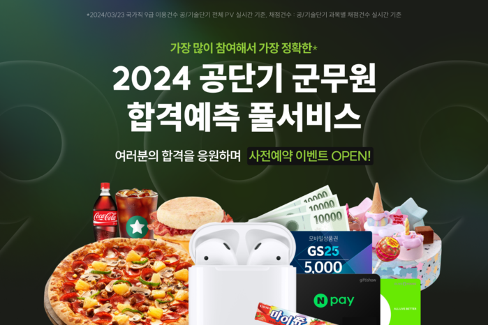 [시민일보 = 여영준 기자] 에스티유니타스의 공무원 시험 전문 브랜드 ‘공단기’는 2024년 9급 군무원 시험의 합격을 사전에 예측해 주는 ‘풀서비스’를 시험 종료 직후부터 이용할 수 있도록 공개한다고 11일 밝혔다.