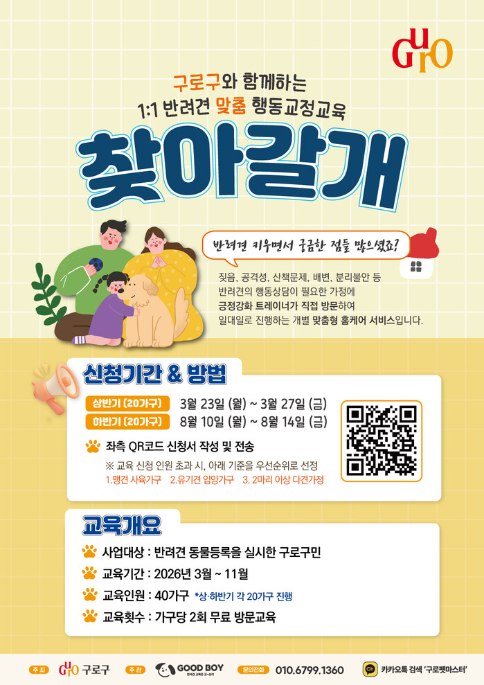 [시민일보 = 박소진 기자] 구로구(구청장 장인홍)가 오는 23일부터 27일까지 5일간 2026년 상반기 ‘찾아가는 펫마스터’ 프로그램 참여 가구를 모집한다.