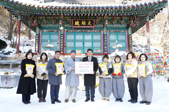 대한불교 조계종 국청사 서호 주지스님이 최근 어려운 이웃에게 전해달라며 경기 광주시에 백미 200포(4㎏, 300만원 상당)를 기탁했다. 사진은 기탁식에서 방세환 시장(오른쪽 다섯 번째)이 관계자들과 기념 촬영을 하는 모습. (사진=광주시청 제공)