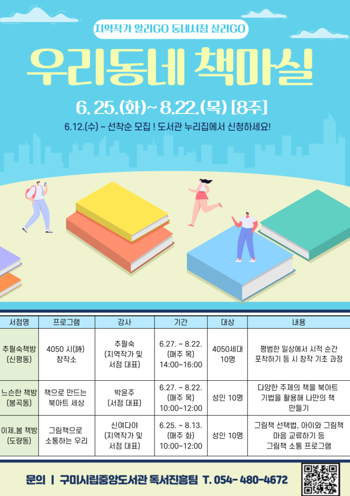 이선임 구미시립중앙도서관장은 “독서에 대한 거리감을 해소하고, 주민들이 자연스럽게 독서의 즐거움을 느낄 수 있도록 다양한 프로그램을 준비했으며, 많은 관심과 참여를 바란다”고 했다.