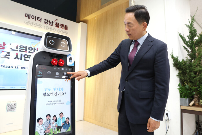 | ▲ 지난 5월 민원안내 강남봇 시연을 하고 있는 조성명 구청장. (사진=강남구청 제공) |