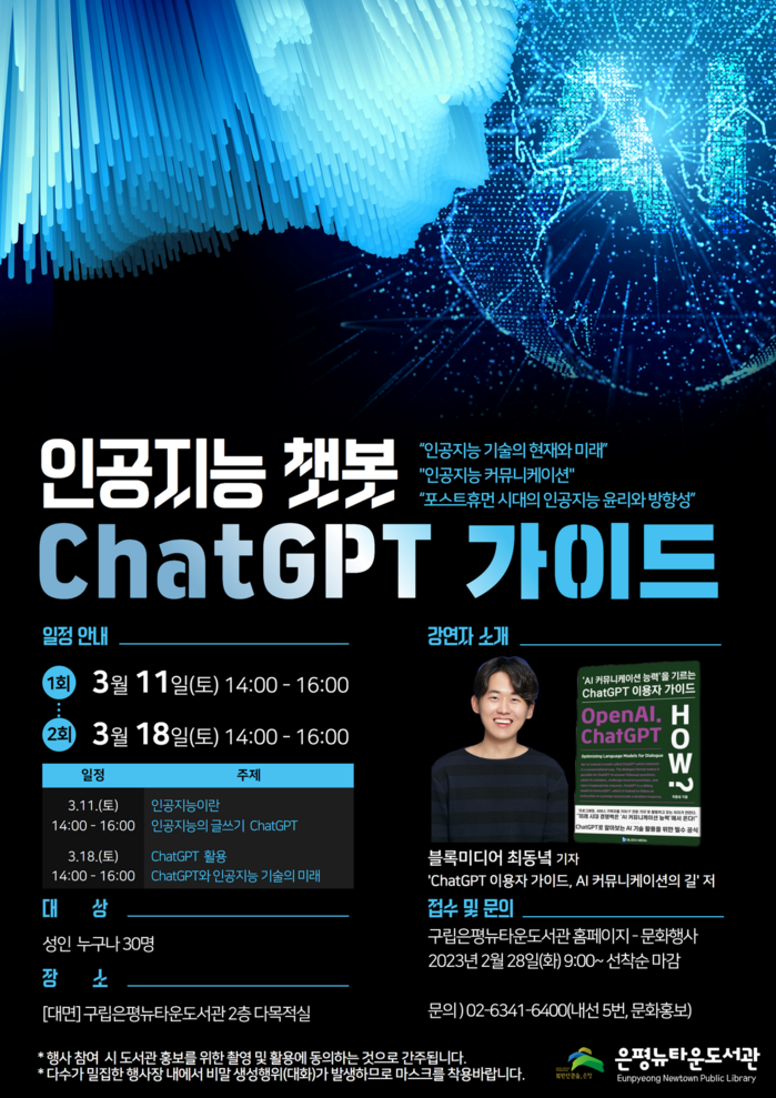 이번 강의는 인공지능 챗봇 ‘ChatGPT’에 관심 있는 성인이라면 누구나 구립은평뉴타운도서관 홈페이지를 통해 선착순 온라인 신청이 가능하다. 자세한 사항은 구립은평뉴타운도서관 홈페이지나 전화을 통해 확인할 수 있다.