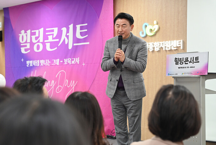 경기 의정부시가 최근 의정부시육아종합지원센터 주관으로 2025년 보육교직원 힐링콘서트 ‘별빛처럼 빛나는 그대’를 개최했다. 사진은 콘서트에서 김동근 시장이 인사말을 하는 모습. (사진=의정부시청 제공)