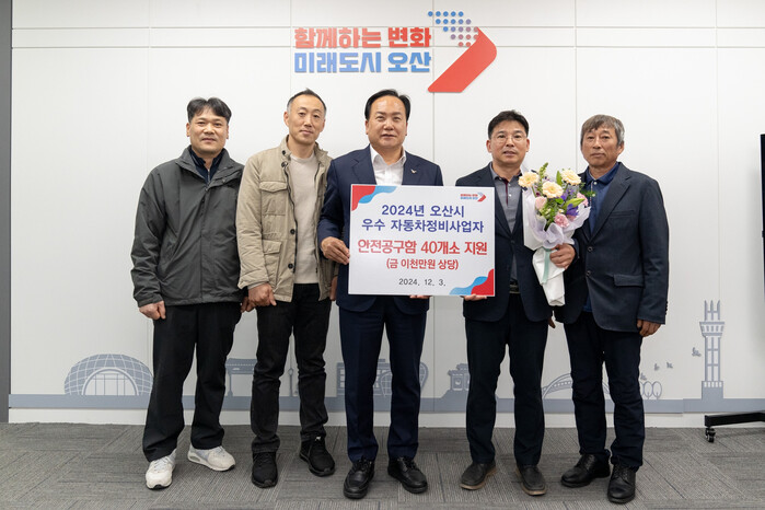 경기 오산시가 최근 자동차정비사업자 지도점검 우수업체로 정비업체 대표 40곳을 선정해 정비업계의 경쟁력 강화 및 소비자 신뢰 제고를 위한 노고를 격려했다. 사진은 이권재 시장(가운데)이 정비업체 관계자들과 기념 촬영하는 모습. (사진=오산시청 제공)