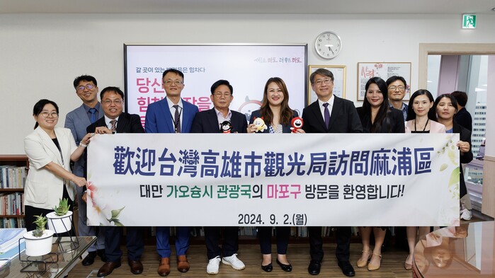 박강수 서울 마포구청장은 지난 2일 마포구청 정책회의실에서 마포구를 방문한 대만 가오슝시 방문단을 맞이했다. 사진은 박 구청장(왼쪽 다섯 번째)이 대만 가오슝시 방문단과 함께 기념촬영을 하고 있는 모습. (사진=마포구청 제공)