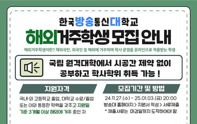 국립 한국방송통신대학교(총장 고성환/이하 방송대)는 지난 2024학년도에 이어 올해에도 재외국민과 외국인 대상 해외거주학생 모집을 이어나간다. 모집 기간은 오는 11월 27일(수)부터 2025년 1월 3일(금)까지다.