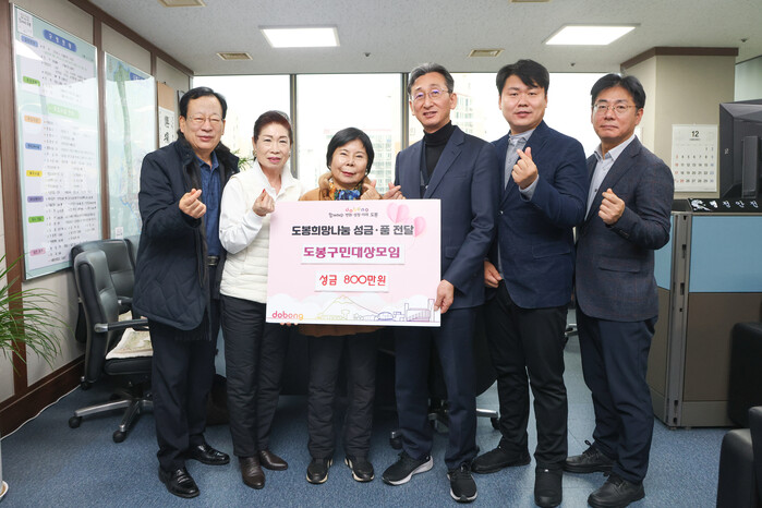 서울 도봉구가 최근 도봉구민대상 모임으로부터 따뜻한 겨울나기 이웃돕기 성금 800만원을 전달받았다. 사진은 전달식에서 관계자들이 기념촬영을 하고 있는 모습. (사진=도봉구청 제공)