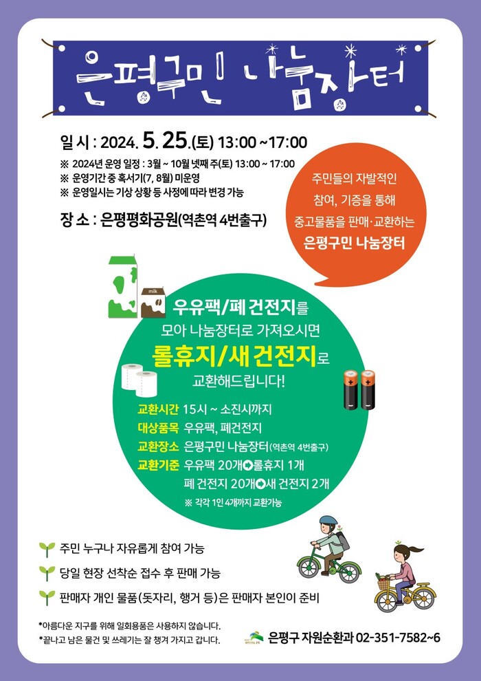 한편 2024년 은평구민 나눔장터는 오는 10월까지 매달 넷째 주 토요일에 은평 평화공원에서 개최되며, 오후 1~5시 운영한다. 단, 혹서기 7, 8월은 제외다.