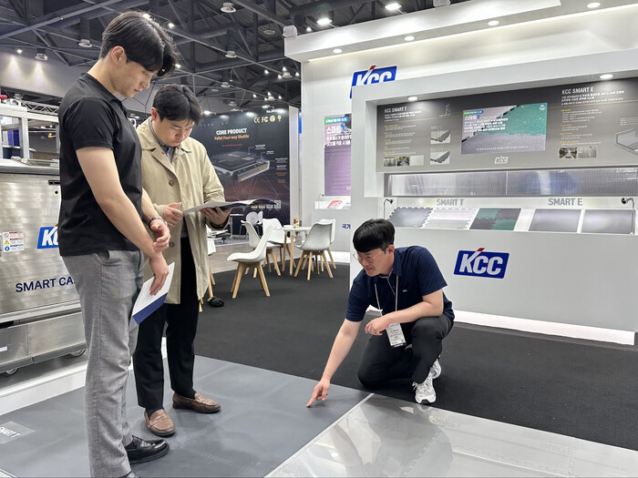 | ▲ KCC가 국제물류산업대전에 참가해 방문객들에게 SMART T 바닥재에 대해 설명하고 있다. (사진=KCC 제공) |