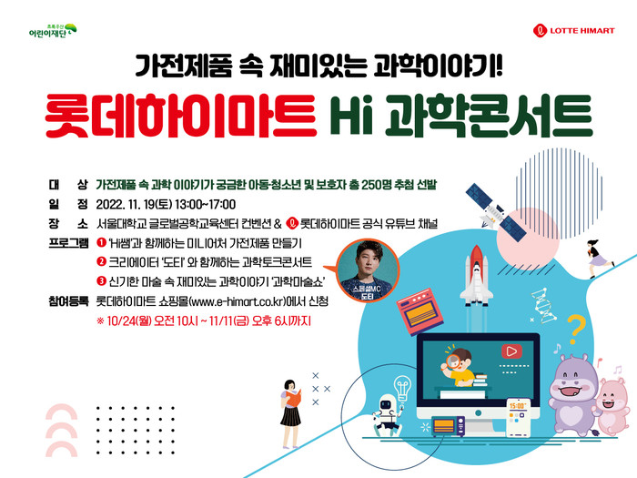 [시민일보 = 홍덕표 기자] 롯데하이마트가 24일부터 오는 11월11일까지 ‘Hi(하이) 과학콘서트’ 참여 신청 접수를 받는다.