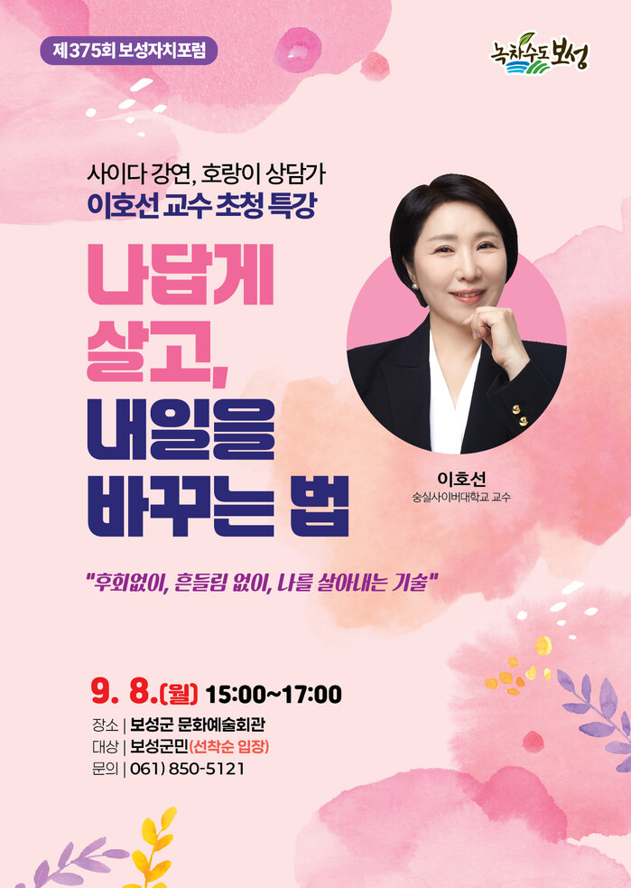 이번 포럼에는 ‘톡 쏘는 사이다 강연’으로 잘 알려진 상담심리 전문가 이호선 교수가 초청돼 군민과 만난다.