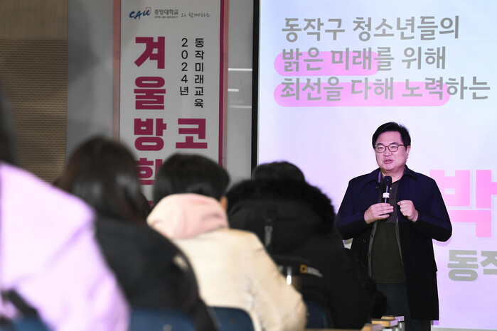 | ▲ 박일하 동작구청장이 지난해 12월 ‘중앙대학교와 함께하는 겨울방학 코딩캠프’에 참석해 인사 말씀을 하고 있다. (사진=동작구청 제공) |