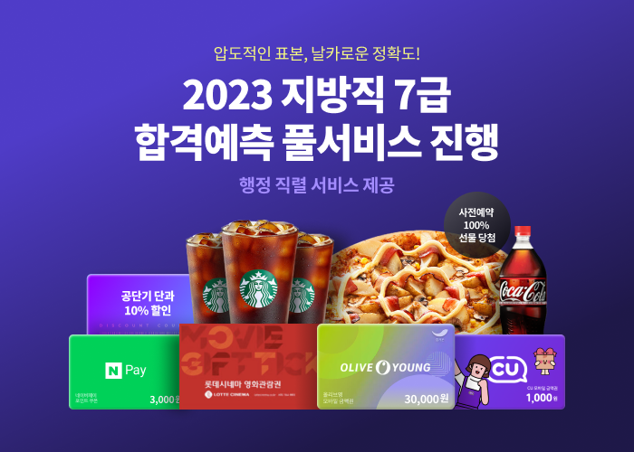 공단기는 2023년 7급 지방직 시험을 준비한 수험생들을 위해 다양한 이벤트도 준비했다. 필기시험 응시 전날까지 진행하는 ▲사전 예약 이벤트는 매일 선착순 300명에게 올리브영, 도미노피자, 스타벅스, 롯데시네마 등의 외식, 문화 상품권을 선물로 제공한다.