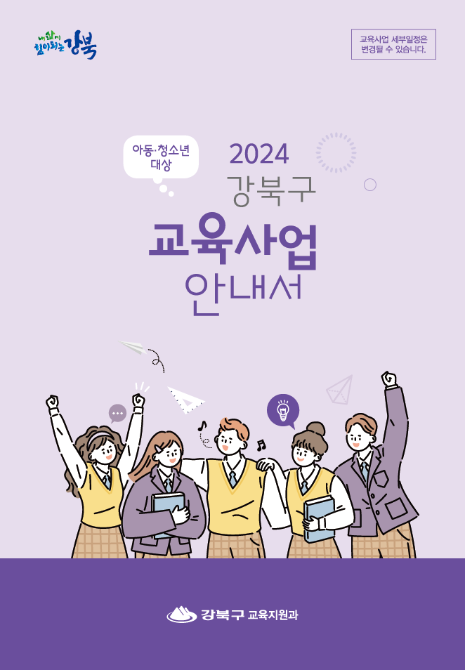 2024 강북구 교육사업 안내서는 강북구청 홈페이지 ▶분야별정보 ▶교육 ▶아동·청소년 대상 교육사업 안내에서 PDF 파일로 내려받을 수 있다.