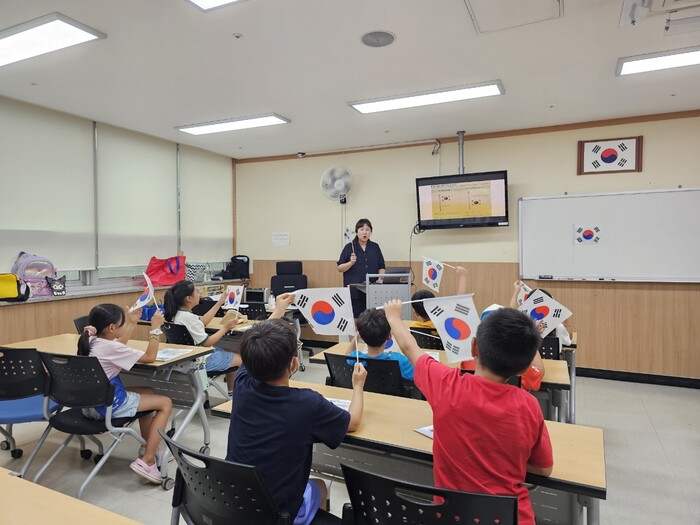 경기 구리시 수택3동 행정복지센터는 다가오는 제79주년 광복절을 맞아 12일 지역 아동들을 대상으로 ‘올바른 태극기 게양 교육’을 실시해 태극기 게양법과 국기 게양 위치 등에 대한 내용으로 진행됐다. 사진은 교육이 진행 중인 모습. (사진=구리시청 제공)