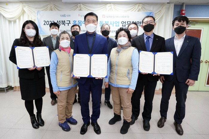 서울 성북구와 HY사회복지재단·성북노인종합복지관이 9일 ‘홀몸어르신 돌봄사업 협약’을 체결했다. 이날 협약으로 HY강북지점 프레시매니저가 노인가구를 방문해 유제품을 전달하면서 안부 등을 확인하고 대상가구에 긴급상황이 발생하면 성북구·성북노인종합복지관과 신속 소통하게 된다. 사진은 협약 체결 후 이승로 구청장(앞줄 왼쪽 세 번째)과 관계자들이 기념촬영을 하는 모습. (사진제공=성북구청)