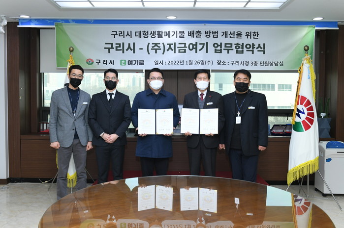 경기 구리시는 26일 (주)지금여기와 '대형생활폐기물 배출시스템 개선을 위한 업무협약'을 체결했다. 양 기관은 협약에 따라 무인 스마트 키오스크 구축(동구동·수택3동 시범운영) 등에 적극적으로 협력할 예정이다. 사진은 협약식에서 관계자들이 기념촬영을 하는 모습. (사진제공=구리시청)