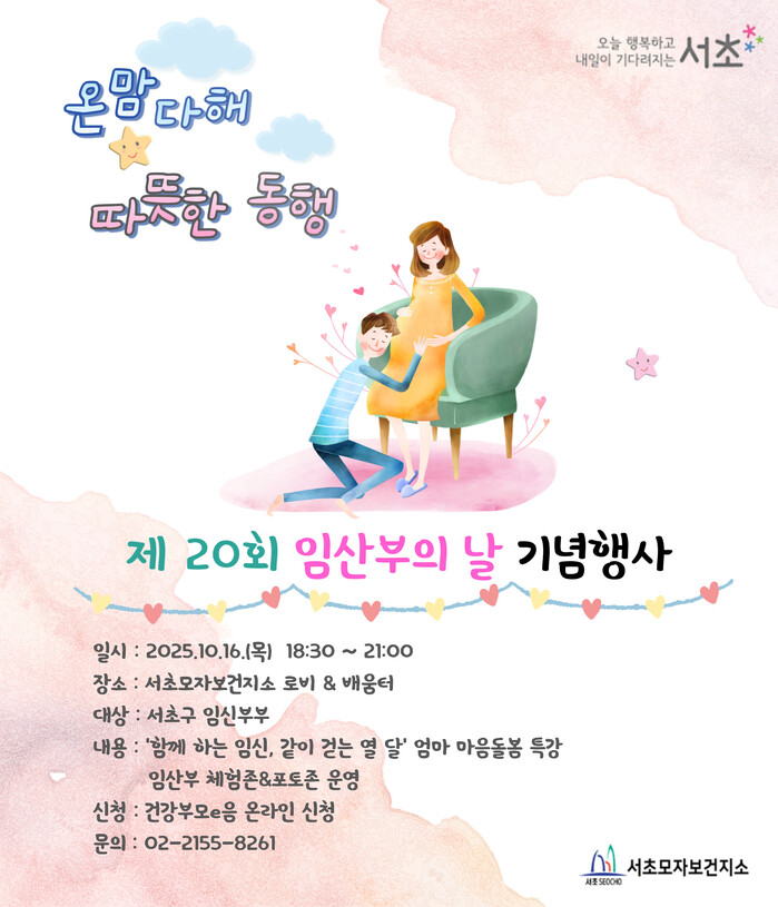 [시민일보 = 박소진 기자] 서초구(구청장 전성수)는 제20회 임산부의 날을 맞아 16일 오후 6시30분부터 9시까지 서초보건지소에서 ‘온맘다해, 따뜻한 동행’을 주제로 기념행사를 개최한다고 밝혔다.