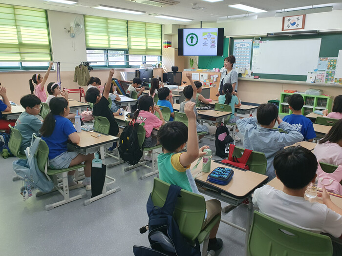 | ▲ 성동구가 지역내 초등학생들을 대상으로 ‘찾아가는 사회적경제 탐구생활’을 운영한다. 사진은 옥정초등학교 교육 모습. (사진=성동구청 제공) |