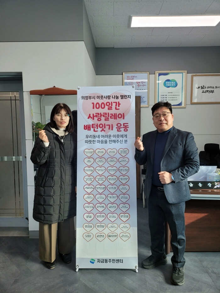 경기 의정부시 자금동 주민센터는 이웃 간 따뜻한 사랑을 전하고 나눔 문화에 적극 참여해 어려운 이웃을 위한 후원을 이어나가는 ‘100일간 사랑릴레이 배턴 잇기’를 성황리에 종료했다. 사진은 배턴 잇기 관계자들이 기념 촬영을 하는 모습. (사진=의정부시청 제공)