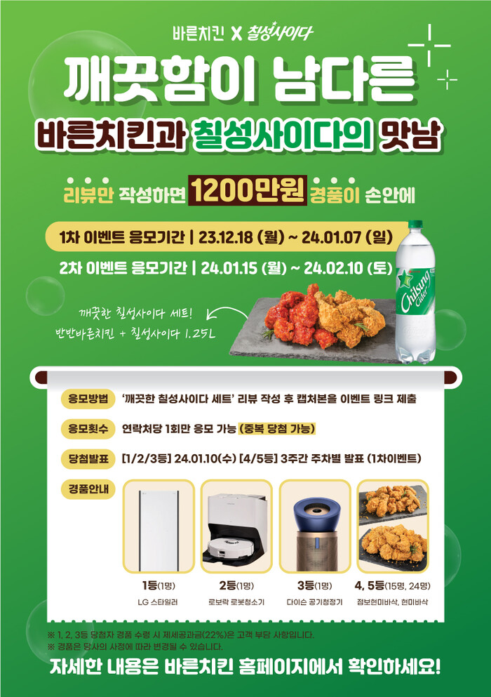 ‘깨끗함이 남다른 바른치킨과 칠성사이다의 맛남’의 의미를 담고 있는 이번 프로모션은 응모기간 동안 한정 판매되는 ‘깨끗한 칠성사이다 세트’를 주문하고 리뷰 작성 시 추첨을 통해 다양한 경품을 제공한다. 깨끗한 칠성사이다 세트는 호불호 없이 즐길 수 있는 양념반, 후라이드반의 ‘반반바른치킨’과 함께 ‘칠성사이다 1.25L’로 구성돼 있다.